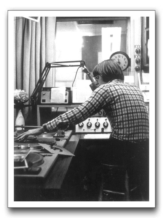 Russ Roberts in the WJMA control room in 1974. At the left side is a Spotmaster cart machine. The control board in front of Russ is a QRK 8 channel mono model that dates from about 1970. The board was moved to studio A in the Fall of 1976 when an Ampro stereo board was placed in the control room. There's a picture of the stereo board in the "places" gallery.