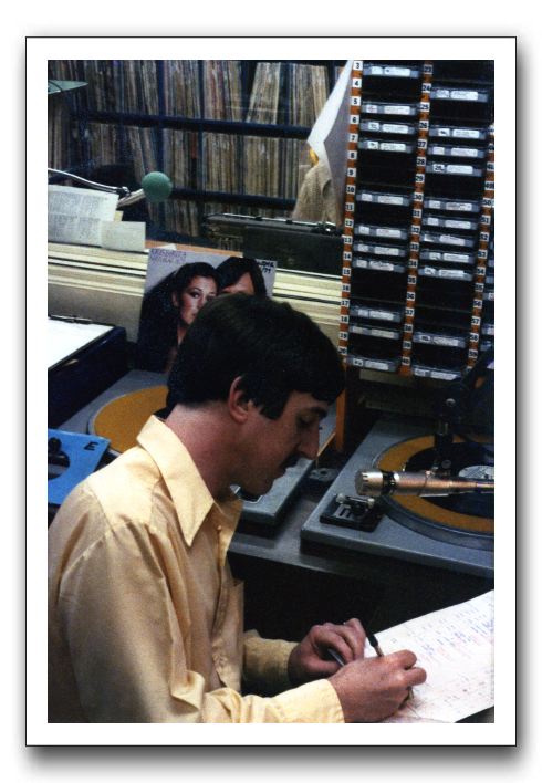 Ross Hunter, WJMA Program Director in 1975. Over Ross' shoulder is a blue record jacket. Records were categorized by color and letter. An "E" would mean either a fairly new record in the music rotation or a song heading down the charts. This picture was taken around 1975 during a mid-day shift when more "E" records would have been played.