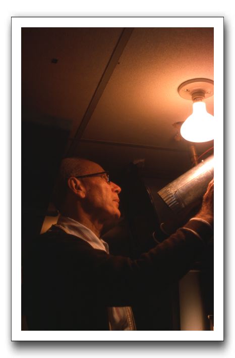 WJMA Chief Engineer Gene Bossieux came to WJMA in 1957 when Woodbury Ober purchsed the station. When WJMA merged with WINA in Charlottesville, Gene moved to Charlottesville to work for WINA. He retired from WINA, but returned to parttime engineering for WJMA in the mid 1970s. In this picture Gene is working on ventilation duct work in the transmitter room.