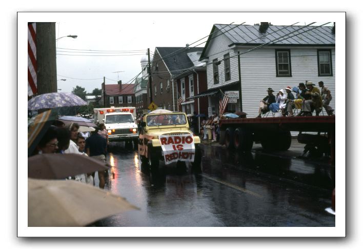 WJMA entered the 1981 Madison County Firemen's Parade. Pat Watson is driving the yellow Jeep and Tom Graves is along for the ride.They're passing the judge's position. Both Tom and Pat were from Madison County.