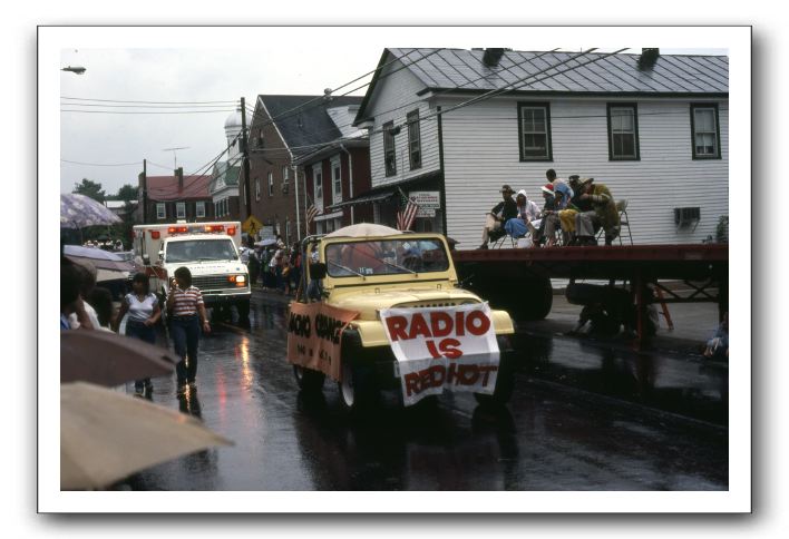 WJMA entered the 1981 Madison County Firemen's Parade. Pat Watson is driving the yellow Jeep and Tom Graves is along for the ride.They're passing the judge's position. That looks like John Fray on the near end of the line up of parade judges.