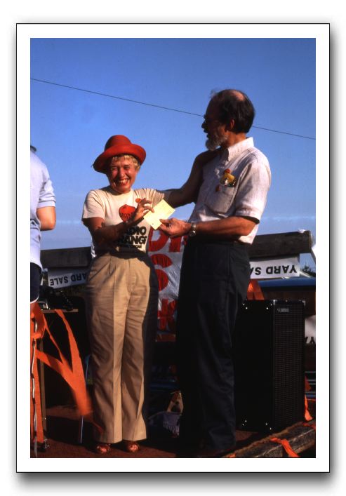 Greene County reporter Mitzi Clark accepts a check from Arch Harrsion at the WJMA booth at the 1982 Greene County Fair. Notice that Arch is wearing two WJMA buttons. Mitzi has one, too, on her WJMA t-shirt.