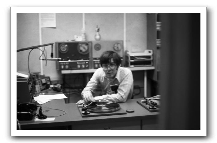 A slightly out of focus 1982 picture of Phil Goodwin in Studio B, one of two production studios at WJMA. Production studios were used to record commercials, PSAs (public service announcements), and other programming.