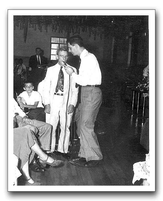 This picture may have been taken at the DeVivi Club in Orange. The young man at the left is Alex Waugh. In the center is W.A. Sherman being interviewed by Art Livick. This undated photo is probably from 1950 or 1951.