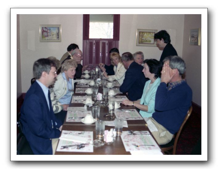 Left side of the table starting furthest from the camera: Tom Graves, Gene Bossieux, Mitzi Clark, Pat Watson, Russ Roberts. Right side of the table starting furthest from the camera: Ross Hunter, Patricia McArver, Marion Harrison, Bill Little, Ann Benzinger (standing), Leri Thomas, Phil Audibert.