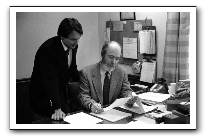This picture is one of a series taken for the April 5, 1984 issue of the Orange County Review. It's a re-enactment of the signing of the sale papers for WJMA to Digby Solomon on April 1. Digby Solomon is on the left, Arch Harrison is on the right.