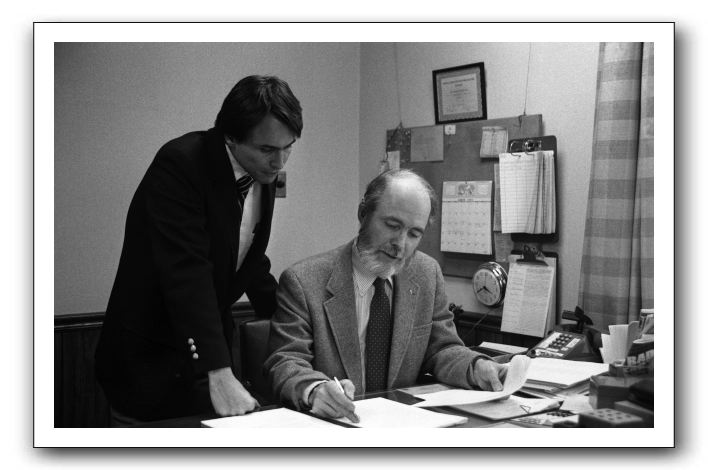 This picture is one of a series taken for the April 5, 1984 issue of the Orange County Review. It's a re-enactment of the signing of the sale papers for WJMA to Digby Solomon on April 1. Digby Solomon is on the left, Arch Harrison is on the right.