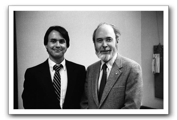 This picture is one of a series taken for the April 5, 1984 issue of the Orange County Review. It's a re-enactment of the signing of the sale papers for WJMA to Digby Solomon on April 1. Digby Solomon is on the left, Arch Harrison is on the right.