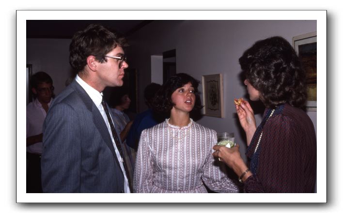 In the fall of 1986 the new owner of WJMA AM/FM, Digby Solomon, held a reception at the Orange Gorument restaurant. Left to right: Ian ??? and Betsy Crowell talk with Susan McCurry.