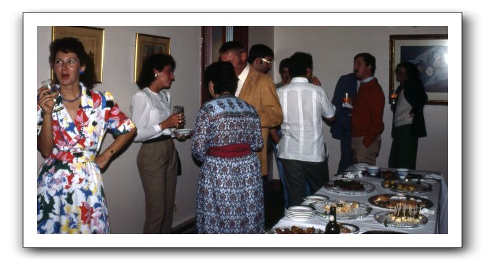 In the fall of 1986 the new owner of WJMA, Digby Solomon, held a reception at the Orange Gorument Restaurant. Left to right: Midge Craun, Brenda Thier, June Krishna, Bill Little, Phil Goodwin, Clint Estes, Digby Solomon (back to camera), Stan Craun (partially hidden), Ross Hunter, Barbara Little