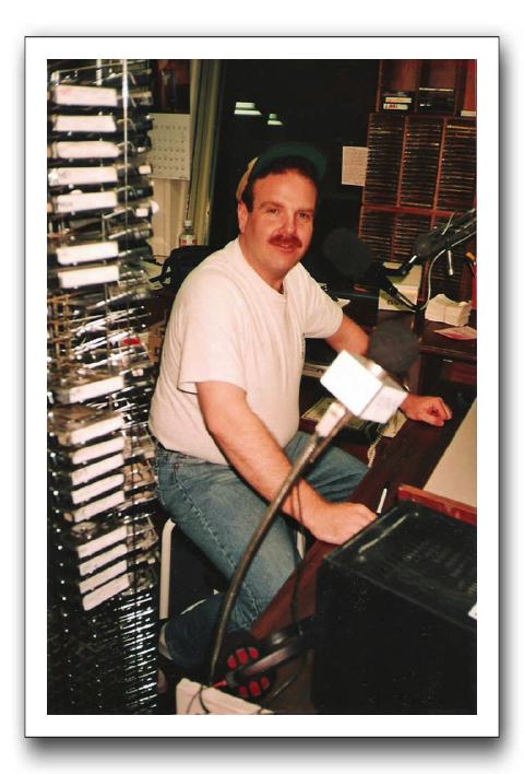 Greg Breeden in the WJMA control room. Studio A is through the window behind Greg. You can just see a bit of the Ampro board at the center right. Based on the calendar on the wall, this photo is from October 1994.photo contributed by Greg Breeden