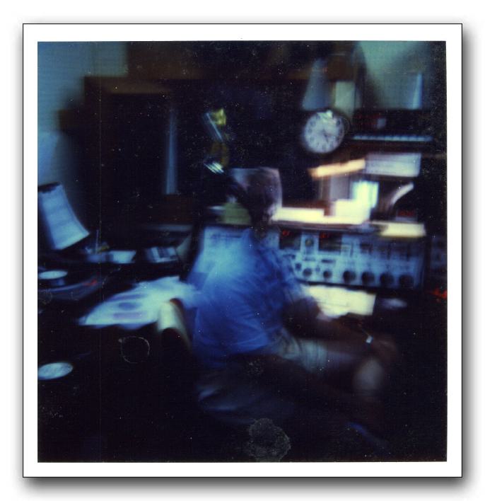 Mark Shepherd provided this 1985 fuzzy Polaroid photo taken in the WJMA Control Room. The person pictured is unknown.photo contributed by Mark Shepherd.