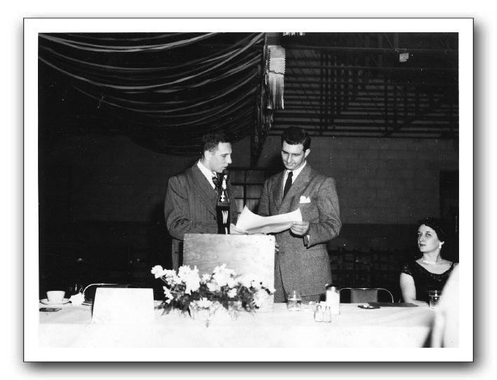 University of Virginia speech professor and president of the Virginia State Junior Chamber of Commerce James M. Mullendore presents WJMA GM Art Livick with the charter for the Orange County Chapter of the Junior Chamber of Commerce, later known as the JCs. Livick was the group's first president when it was formed in 1952.