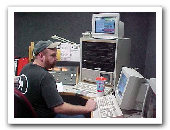 Greg Breeden in the WJMA production studio (old Studio B) in 1999. The rack in the center of picture holds two CD players and other equipment. The computer at the far right is the waveform monitor for editing audio.contributed by Greg Breeden