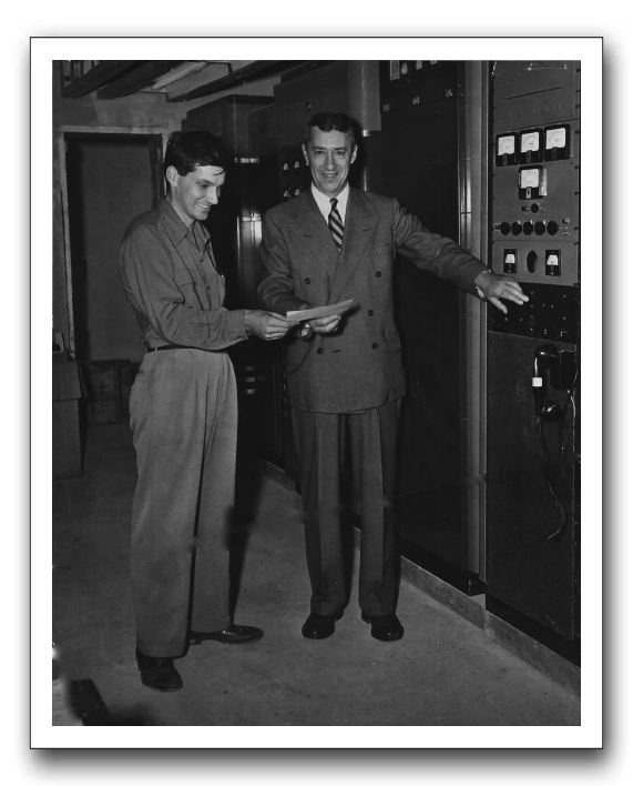 His engineer Warren Braun (left) built the studios and transmitter location for WJMA at the DeVivi Restaurant in Orange. This picture was taken at WSVA in 1950.