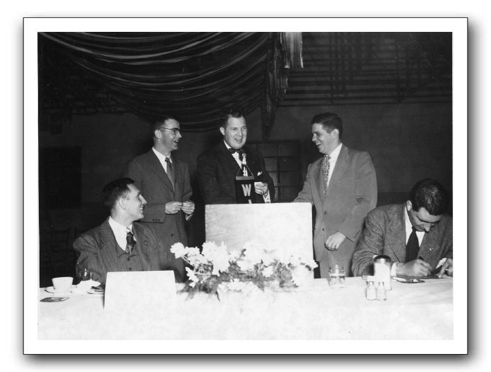 (left to right) Dr. James M. Mullendore, Harry Mason, George Rawlings a Fredericksburg politician, Newton Sparks, WJMA General Manager Art Livick leaning over and writing. The occassion is the Orange Junior Chamber of Commerce Charter Night on January 14, 1952 at the DeVivi Club. Livick was the group's first president. Mason the first vice president and Sparks the second vice president. Mullendore, a speech professor at UVa and state president of the Junior Chamber of Commerce, was the evening's guest speaker.