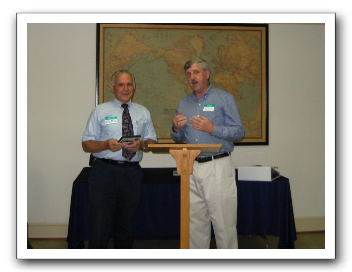 Ross Hunter (r) presents a copy of Now This... a history of the first 35 years of WJMA to Orange County Historical Society president Tony Rizzo at the Society's April 2010 regular meeting. The Society will add the DVD to its archive.