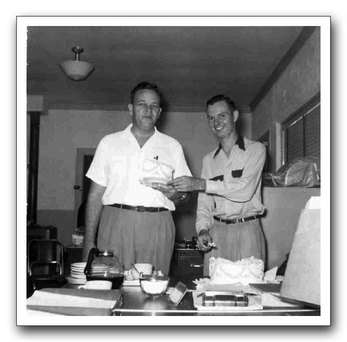 September 6, 1952 was Chuck Brown's (r) 25th birthday. Chuck recalls I was always the clown, so if you notice, I cut about 1/4 of the cake and handed it to Tubby as his piece of cake. Of course he didn't eat all of it. My mother had sent Tubby the money to buy me a birthday cake and surprise me with it on my birthday, which he did, and caught me completely off gaurd!