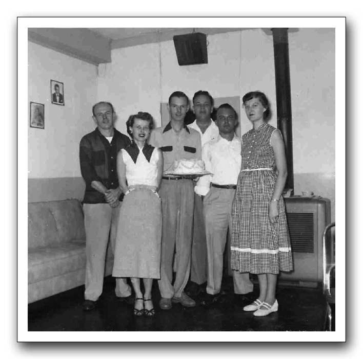 then of course it's me holding my birthday cake; then Tubby Walthall the manager; and I can't remember the names of the next two. The girl was the secretary, but I can't remember her name or anything about her.
