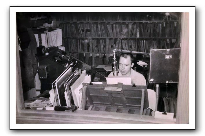 Arch Harrison on the air at WFVA, Fredericksburg, Virginia, in a photo dated January, 1957. By July, 1961 Arch would be the owner of WJMA in Orange.contributed by Reid Harrison