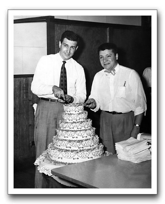 Observing WJMA's first day on the air September 10, 1949, General Manager Art Livick (left) and landlord Al DeVivi cut a celebratory cake. According to the Orange Review, the cake weighed 40 pounds.