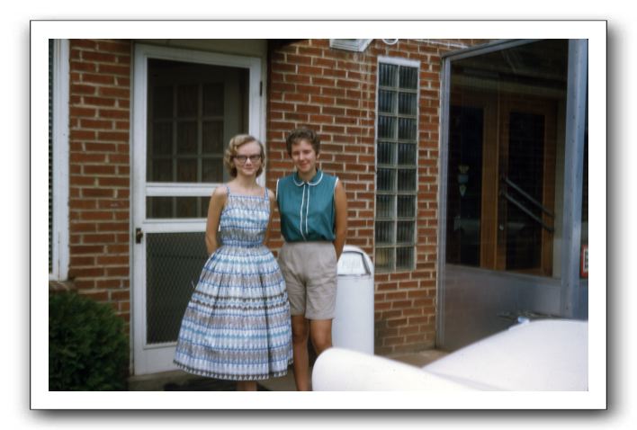 WJMA secretary Beverly Swallow standing just outside the WJMA studios at the DeVivi Restaurant. Next to her is Gwen Jones daughter of George Jones Superintendent of Virginia Tech's Piedmont Research Station. He was often heard on WJMA's agricultural programs. This image from July 1959 is a scan of a slide.