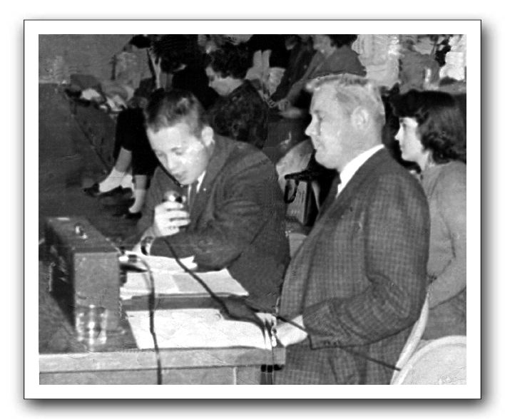 That's Don Little on the left with the microphone and Bill Little on the right. They're broadcasting an Orange County High School basketball game. The date is uncertain, but we'll call it 1968 until a better date is found.