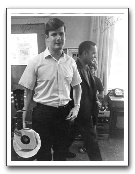Ted Carroll, Virginia Tech Extension Agent, Mayor of Orange, and WJMA football play-by-play announcer in the WJMA office. Behind him is Hugh Darnell and peeking out from behind Hugh is Reid Harrison.
