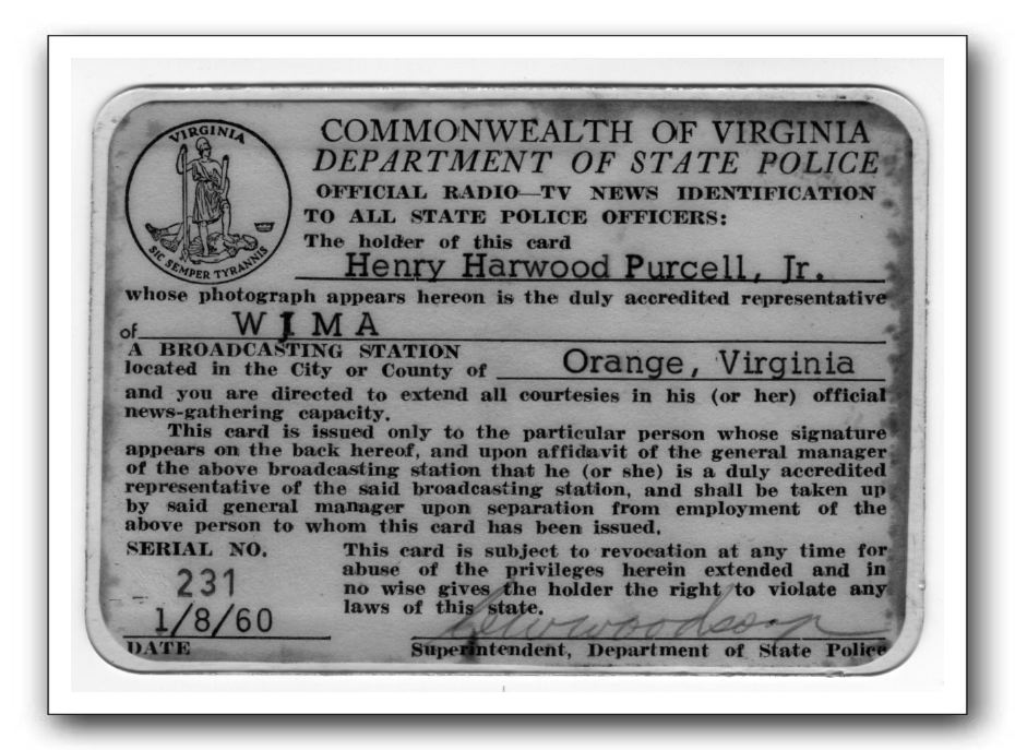 Woody Purcell’s Virginia State Police Press ID card issued in January, 1960.contributed by Woody Purcell