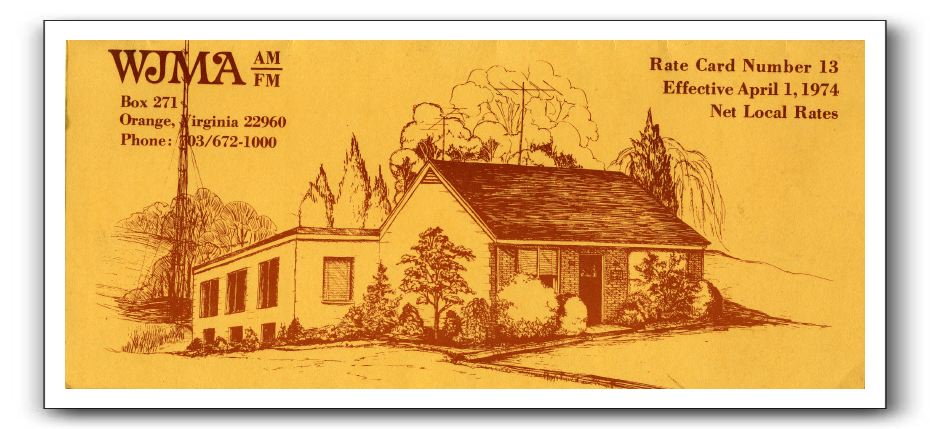 This is the cover to WJMA's 1974 advertising rate card. The drawing of the WJMA building is by Jean Love. The original WJMA building was built in late 1959 or early 1960. The addition to the building (on the left side of this drawing) was built in 1974.