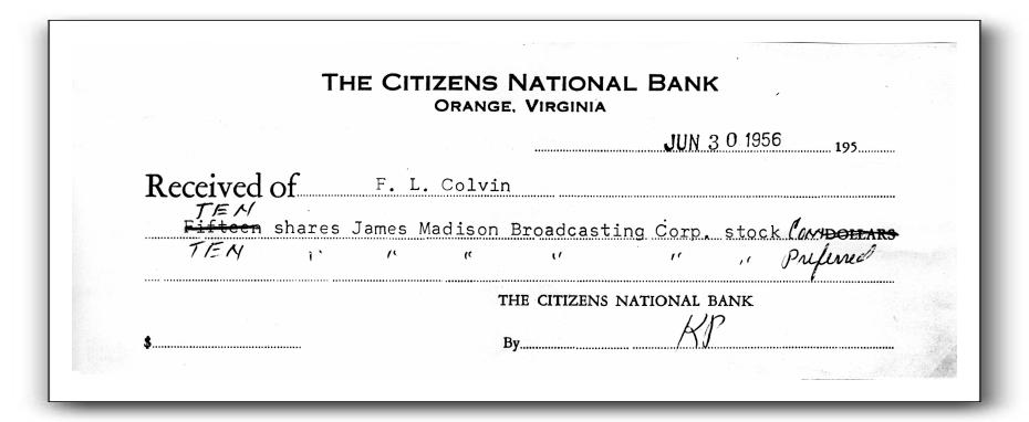 This receipt for WJMA stock is dated June 30, 1956. Frank L. Colivn was an original WJMA stockholder and he was selling to Woodbury Ober who was in the processing of buying out all the other original stockholders.