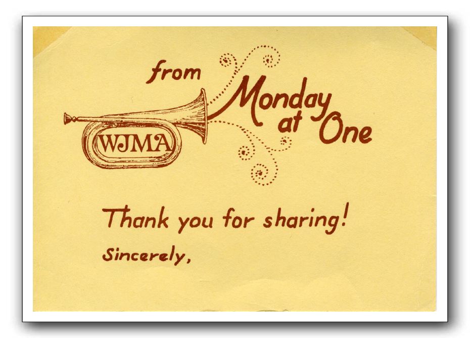 Jean Love created this card in 1973 or 1974. It was used as a "thank you" to guests who had appeared on Monday At One.contributed by Jean Love
