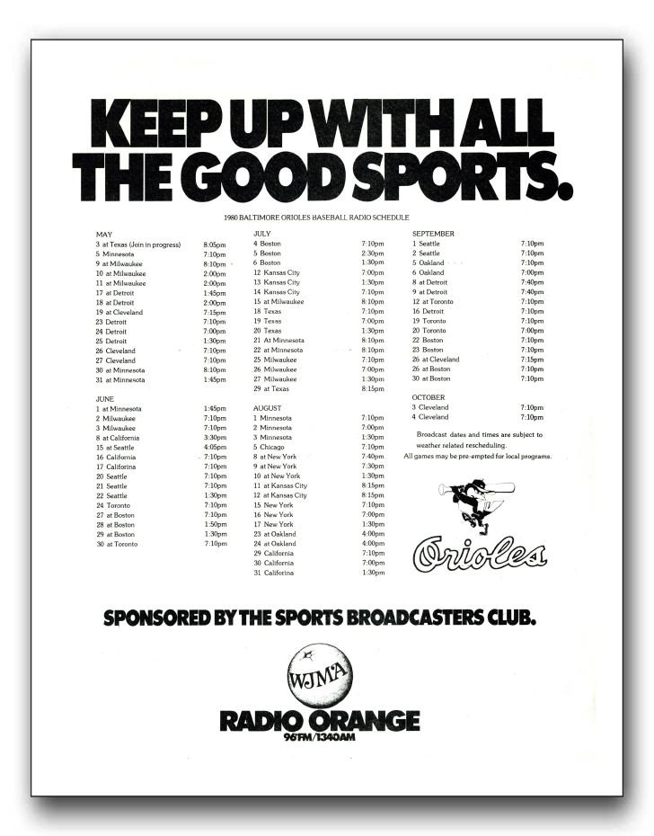 Sheets such as this were printed for each sports season and given to Sports Broadcaster's Club sponsors. Many sponsors made them available to customers. This page dates from the 1980 baseball season. These sheets were used in the late 70s and early 80s,