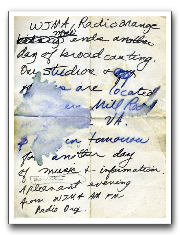An unknown announcer scribbled this script for sign off. The date is uncertain, but probably it's from sometime between 1977 to 1984 when WJMA called itself Radio Orange.