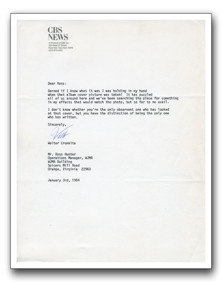 This letter from Walter Cronkite was received in response to a letter to him asking about a partially visible item in his hand on an album cover. The album is "Cronkite, The Way it Was, The Sixties".contributed by Ross Hunter
