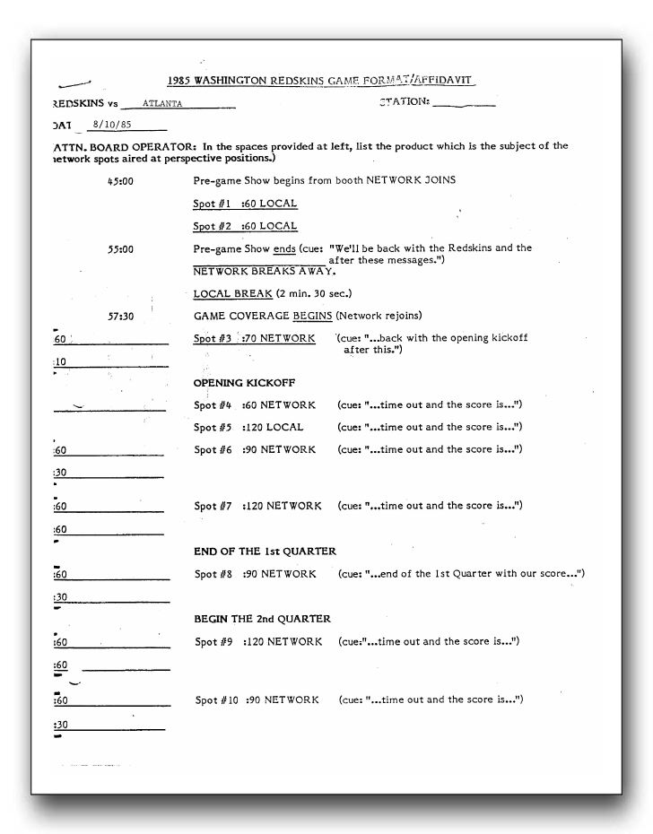 This is a copy of the local station board operator's format sheet for a 1985 Washington Redskins broadcasts. All games would have used the same structure.