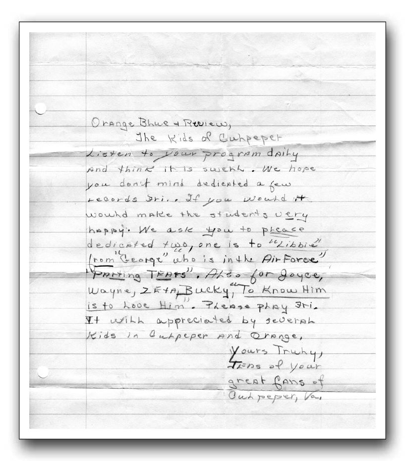 The letter is typical of request letters received by WJMA in 1959. Listeners requested songs to be played on The Orange and Blue Review or Teen Time which aired between 4 and 5 weekday afternoons.contributed by Jack Du Long