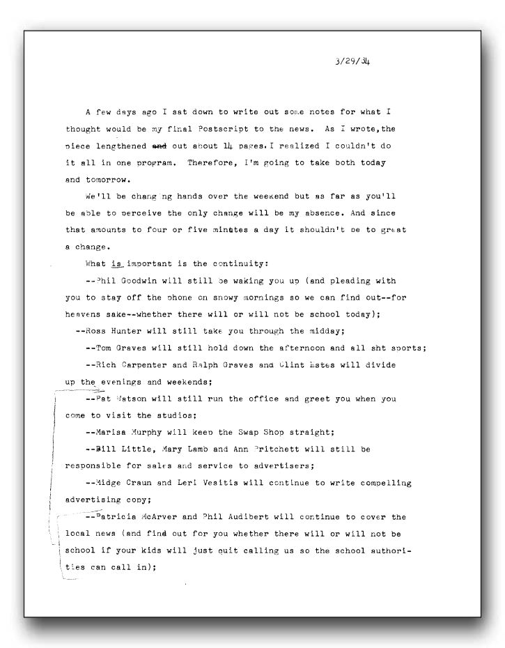 This is page one (of 5 pages) of Arch Harrison’s next to last Postscript to the News on March 29, 1984. The sale of WJMA would be effective April 1, 1984.