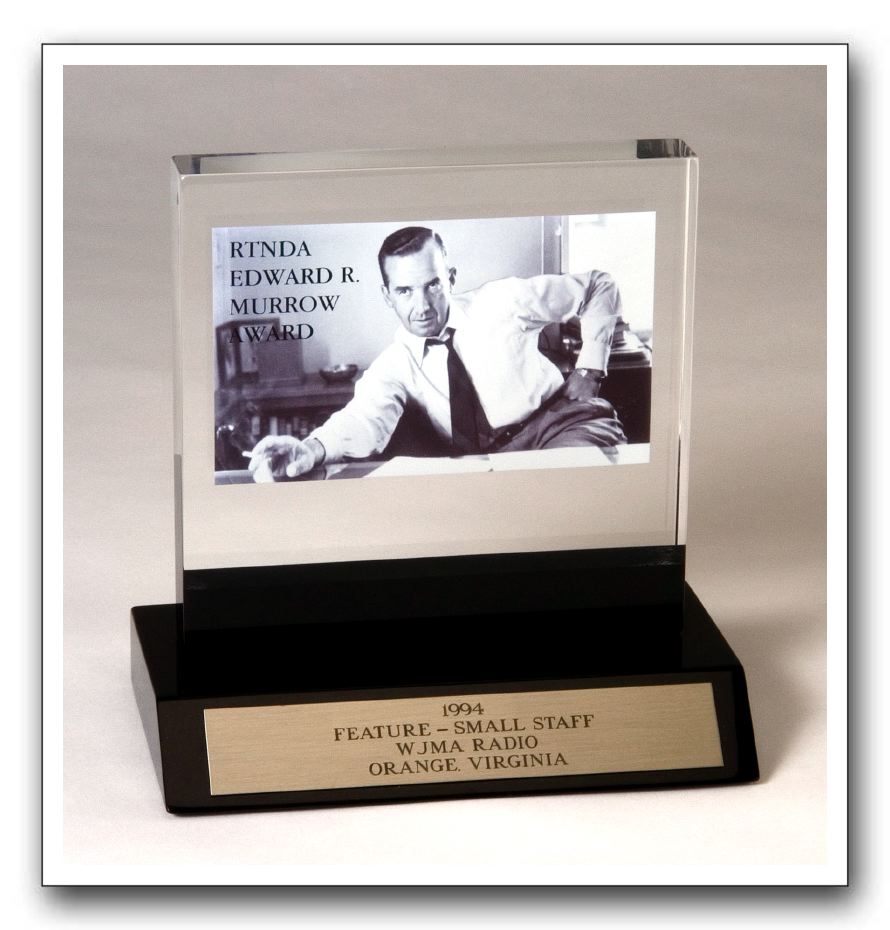 In 1994 Phil Goodwin's feature story Water Discovered about the rehabilitation of a drinking fountain on Main Street in Orange was chosen by the Radio Televison News Directors Association as the best in the country among small market radio stations. The story first won in RTNDA Region 13 consisting of stations in Deleware, Maryland, The District of Columbia and Virginia. It then went to national competition where it won again. Phil traveled to the national RTNDA meeting in Los Angeles where Andy Rooney presented the award to Phil. Rooney told Phil, "I heard your story. The writing was good." Phil says it was the highlight of his career. Phil also likes to point out that this version of the award shows Murrow with a cigarette. Newer versions of the award have been "corrected" to remove the cigarette.