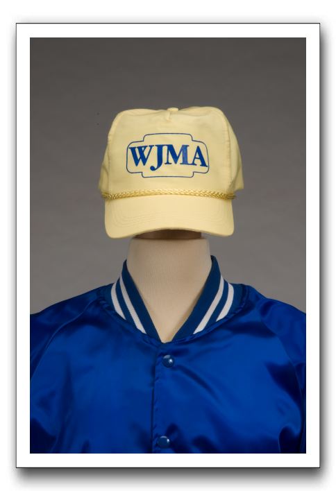 This hat is from about 1993. It features a new logo introduced by Piedmont Communications who had just purchased WJMA AM & FM.photo by Mike Remorenko/ Design 3 mannequin loaned by Jamie McConnell/ LifeShade hat contributed by Clint Estes