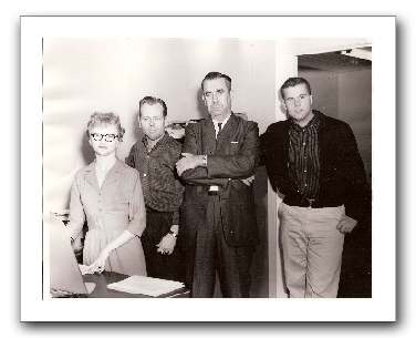 (l-r) Beverly Swallow, Roland “Branch” Twigg, Claude White, and Woody Purcell. This picture is from 1960 and was taken in the reception area of the then new Spicers Mill Road studios.contributed by Bev Aylor