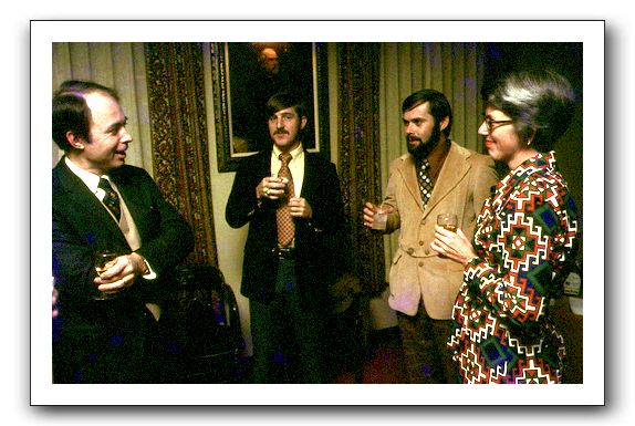 This picture is probably from the winter of 1972. It is most likely from one of the WJMA's "Pepsi Parties". Profits from the station's Pepsi machine were use to take the staff out to dinner once or twice a year. The location is not certain, but it may have been That Steak Place, a Charlottesville restaurant.