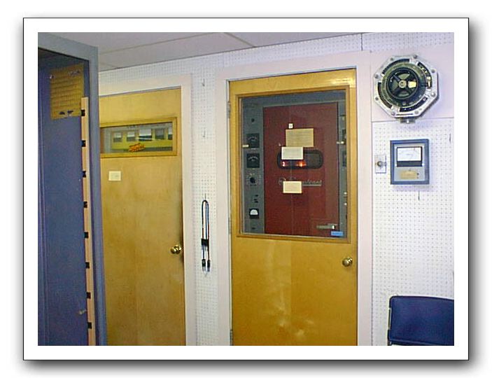 Both transmitters have been retired, although the RCA remains as a standby. The wall separating the studio from the transmitters is now glass with sliding doors for access. The Variac at the top right and meter below it are gone.