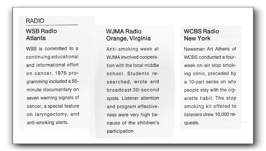 WJMA was in pretty good company as one of the three national winners of a November 7, 1975 award from the American Cancer Society. This is a portion of the program book showing the radio winners.contributed by Ross Hunter