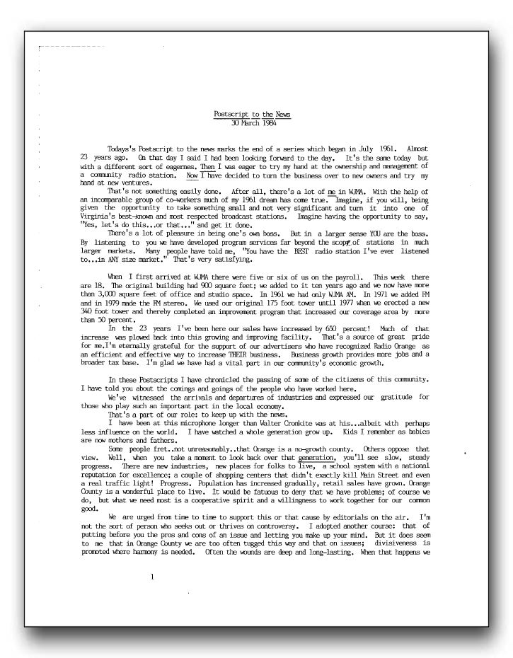This is page one (of 2 pages) of Arch Harrison’s last Postscript to the News on March 30, 1984. The sale of WJMA would be effective April 1, 1984.